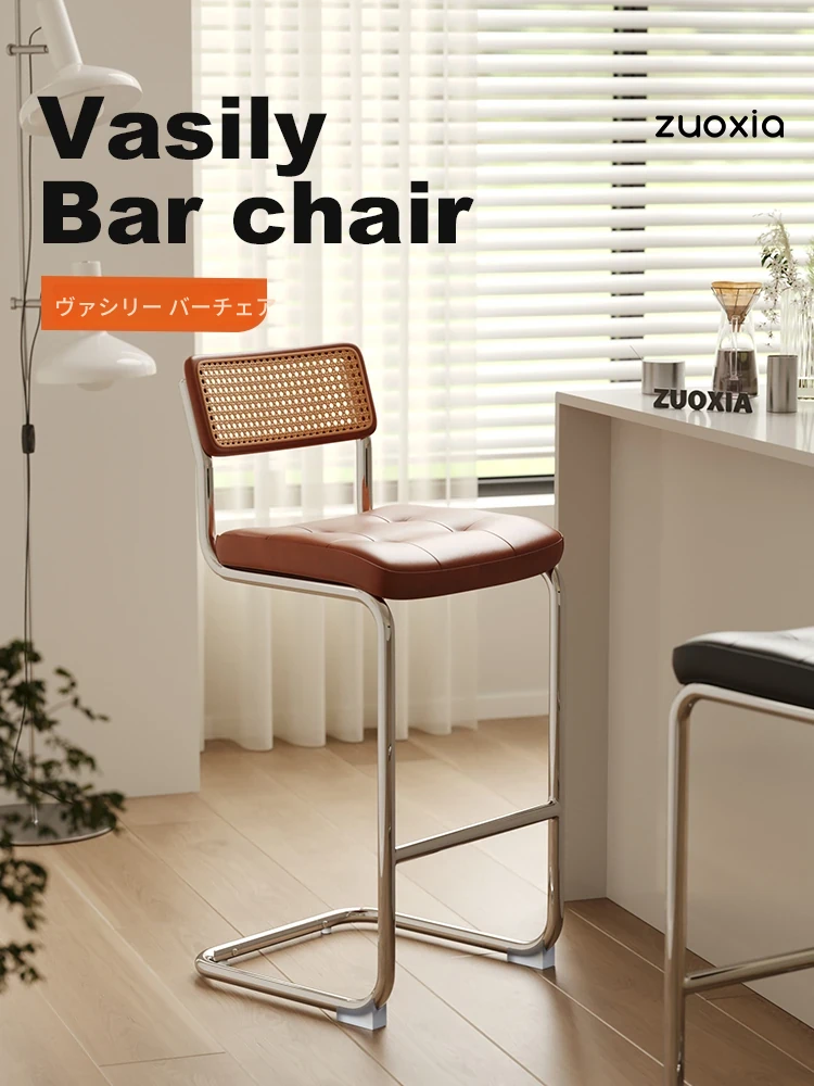 左下瓦西リーバーチェア|北欧レトロデザインのモダンシンプルな藤編みバースツール|ステンレス背もたれ付きの高脚椅子で、居心地の良いカフェスタイルを楽しもう!