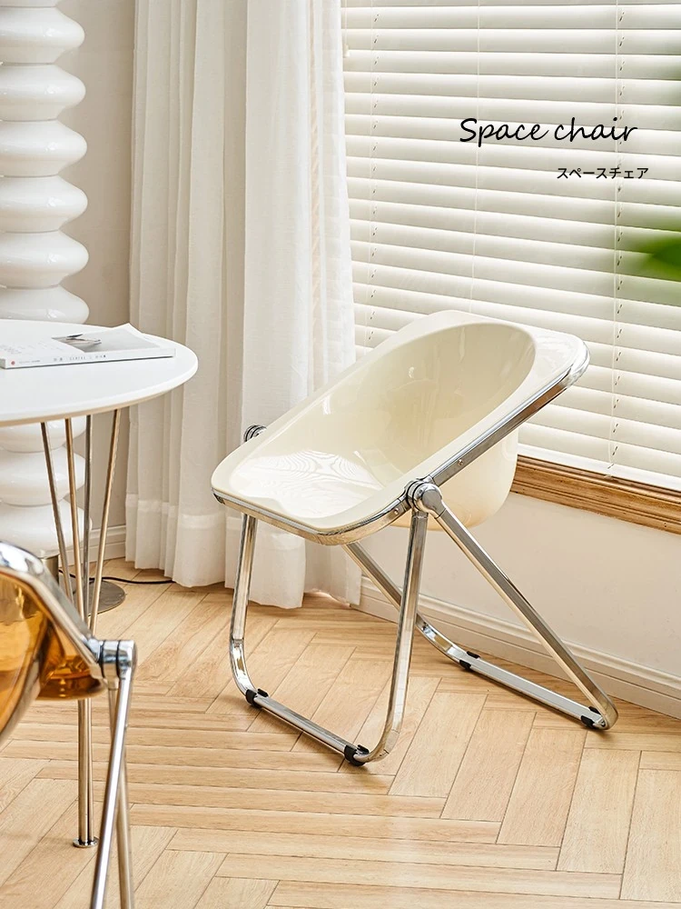 左下北欧風デザインのヴィンテージ折りたたみ椅子!インスタ映えするクリエイティブなアクリルカフェチェア、リラックスしたいあなたにぴったりの家庭用ダイニングチェア。おしゃれで機能的な空間を演出!