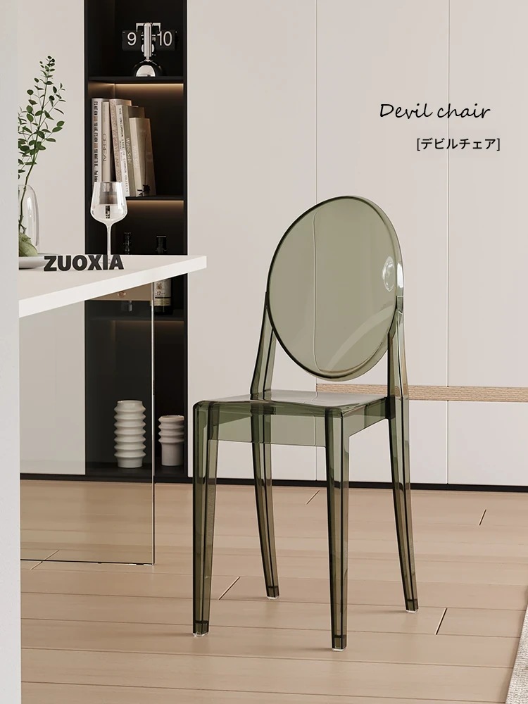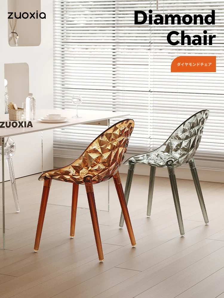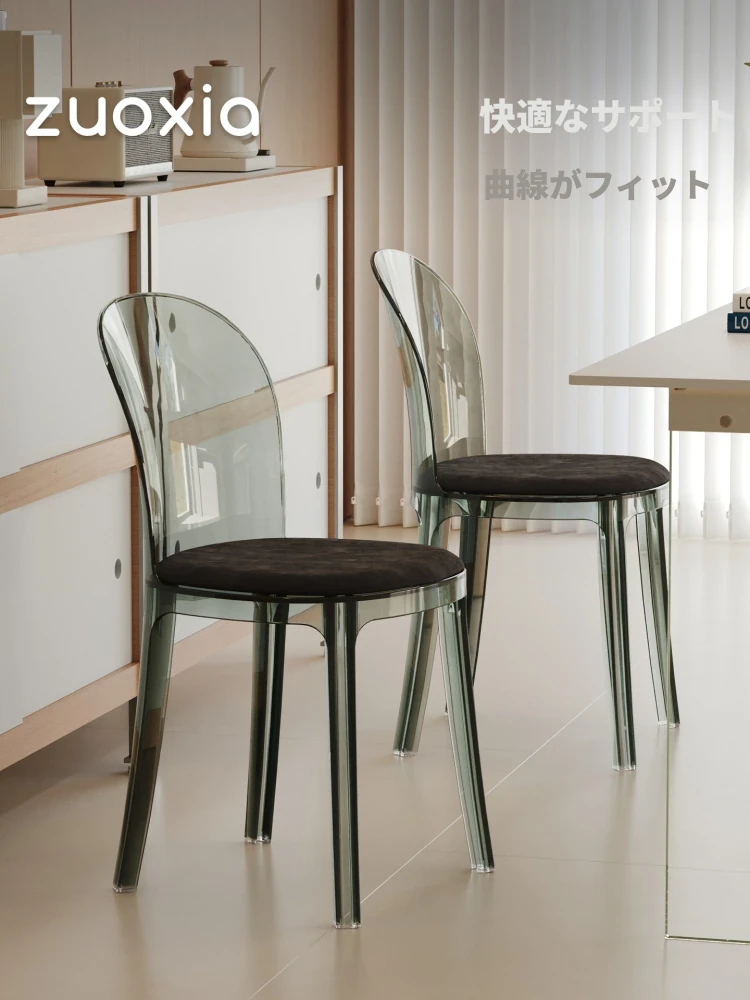 左下北欧スタイルのアクリル製ダイニングチェア!クリエイティブデザインでおしゃれな透明感、インスタ映え間違いなし!快適な背もたれ付きで、ダイニングや書斎にもぴったりな一品。あなたの空間を格上げするアイテムです!