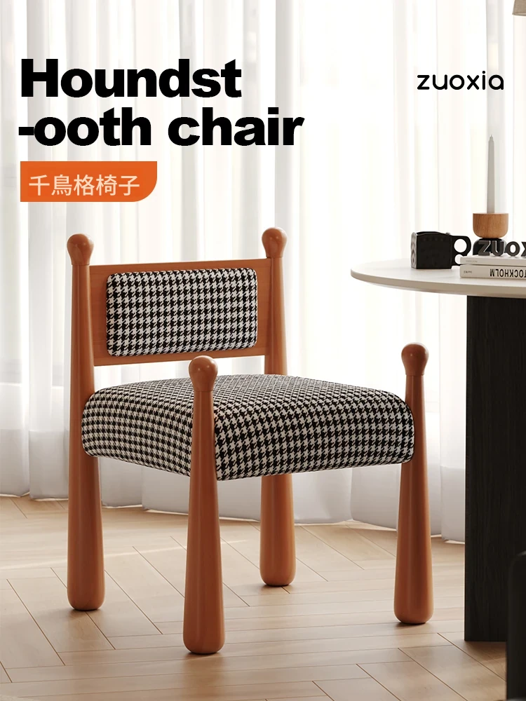 左下千鳥格デザインの北欧スタイル実木ダイニングチェア - おしゃれな背もたれ付き、ソフトパッキングで快適な座り心地!家での食事を特別な時間に演出する、理想的なレストラン風チェアです。