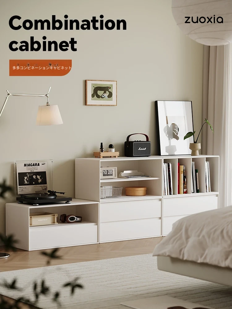 左下のクリーム風収納ラック - おしゃれなリビングにぴったりの白い本棚兼テレビ台!自由自在に組み合わせられるデザインで、収納力抜群!あなたの空間を美しく演出します。