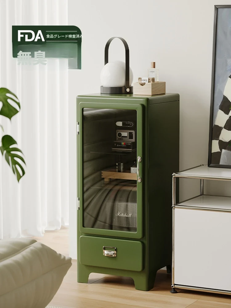 レトロなデザインの左下MOMAキャビネット - 日本式ガラスディスプレイキャビネット、リビングルームにぴったりの家庭用メタルチェスト。フィギュアや小物の収納に最適!おしゃれな収納でお部屋を彩ります。