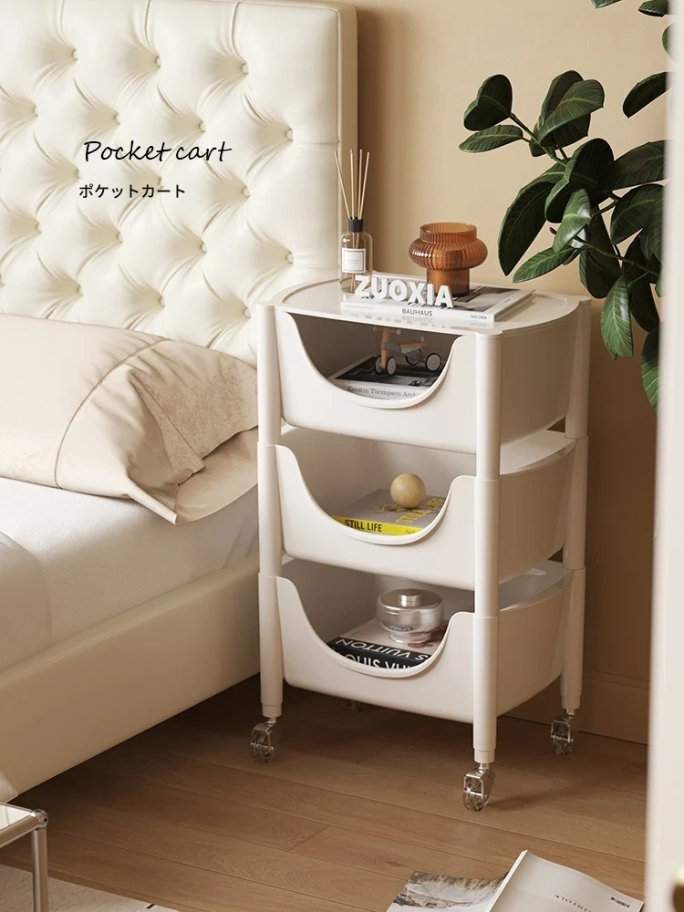 左下月球車風格のシンプルなナイトテーブル - モダンなデザイン、クリーミーカラー、小スペースにもぴったり!移動可能で便利な収納ラック。おしゃれで機能的な寝室を演出します!