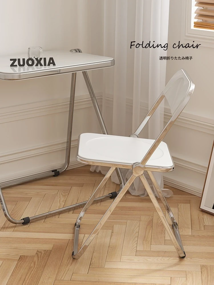 左下北欧スタイル折りたたみ椅子|シンプルでモダンなデザインの背もたれ付き|金属とアクリルの組み合わせで耐久性抜群|おしゃれなダイニングやリビングに最適な人気の化粧椅子!